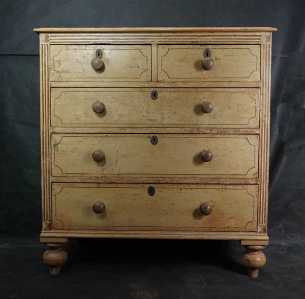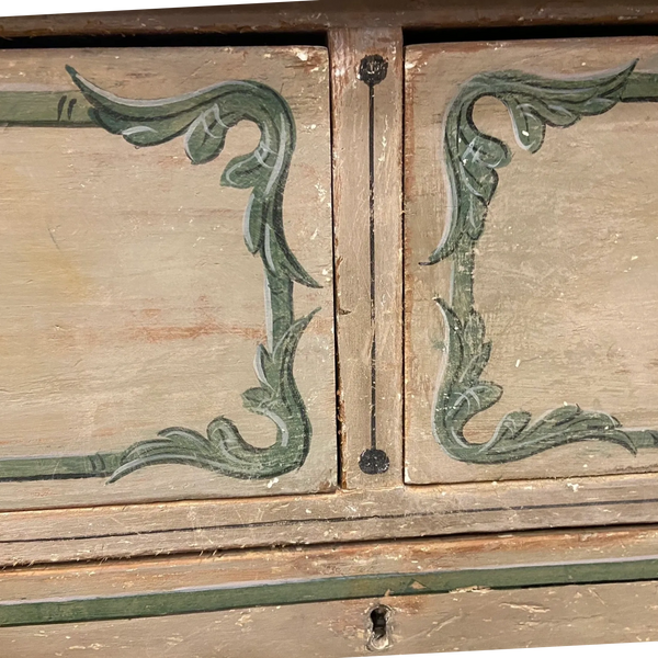 Less often but more common on earlier pieces, a flat paint was employed, often called 'drab' if destined for the kitchen, servants rooms or the scullery. There were also pieces that were designed to be seen and admired, fashion statements if you like, these were decorated in stylised patterns, simulating panels or motifs currently in vogue - such as chinoiserie or classical scenes.